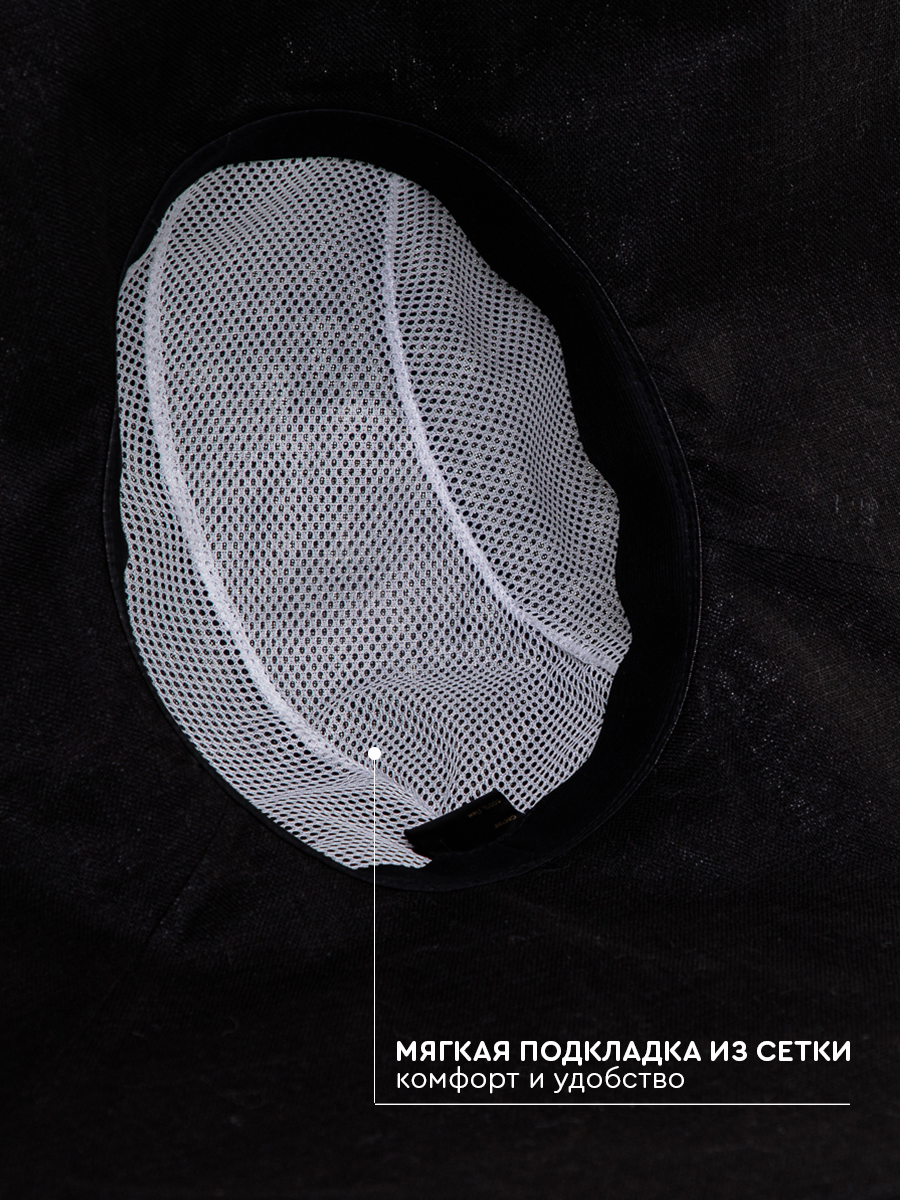 Тулья аккуратной округлой формы комфортно «садится» по голове и не создает лишнего объема. Тонкая контрастная тесьма лаконично украшает модель.
