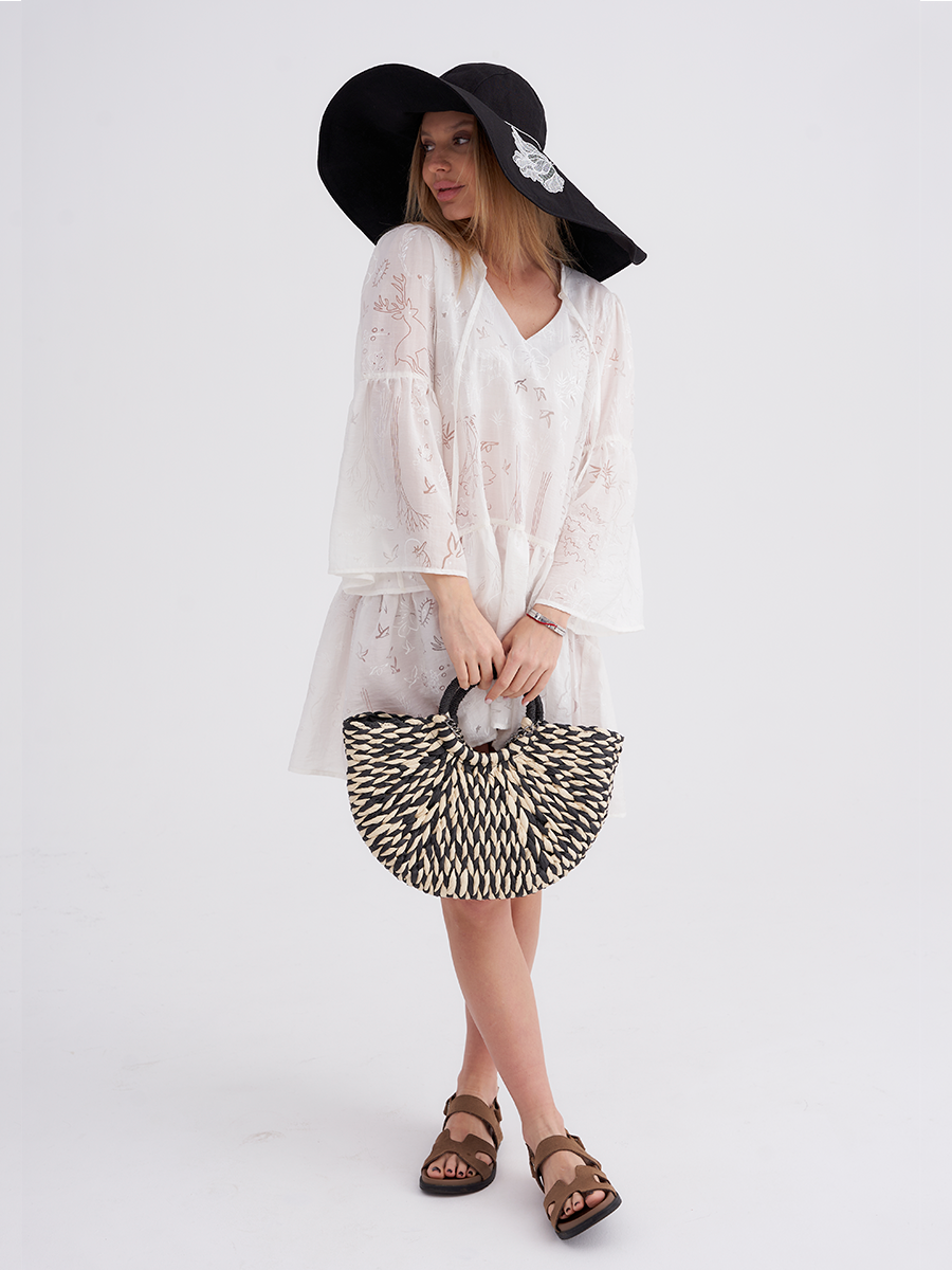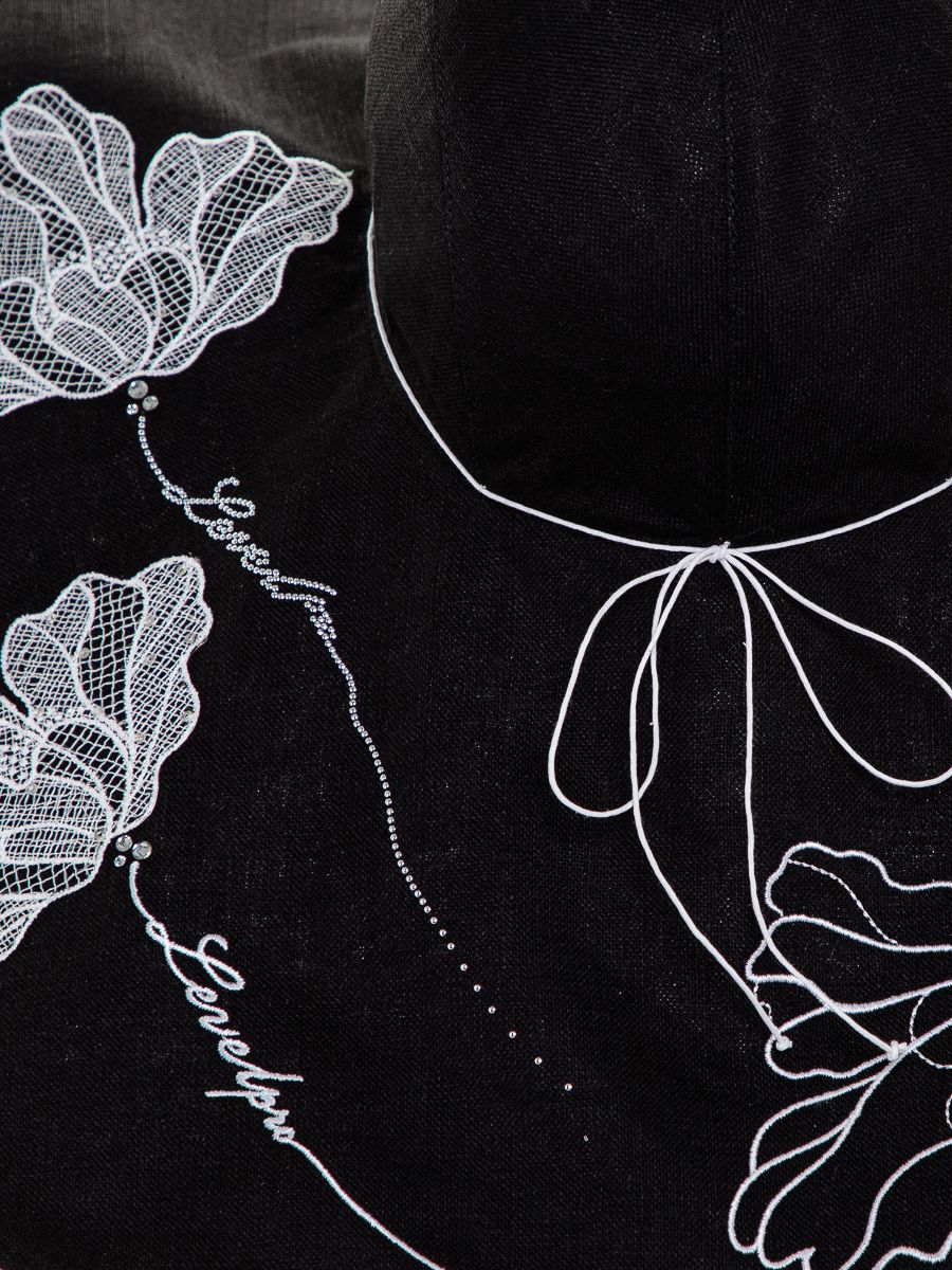 Широкие поля расшиты тонкой вышивкой в виде распустившихся бутонов.